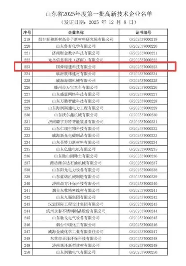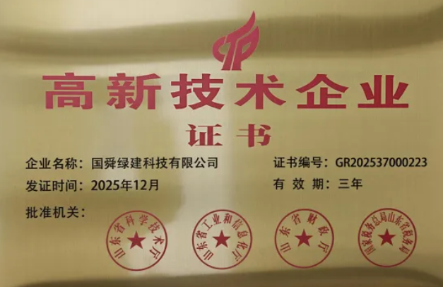 日前,山东省科学技术厅发布2025年度高新技术企业认定公示结果,国舜绿建科技有限公司(以下简称“国舜绿建”)凭借扎实的技术创新实力、丰硕的研发成果及卓越的产业转化能力,成功上榜山东省2025年度第一批高新技术企业名单。